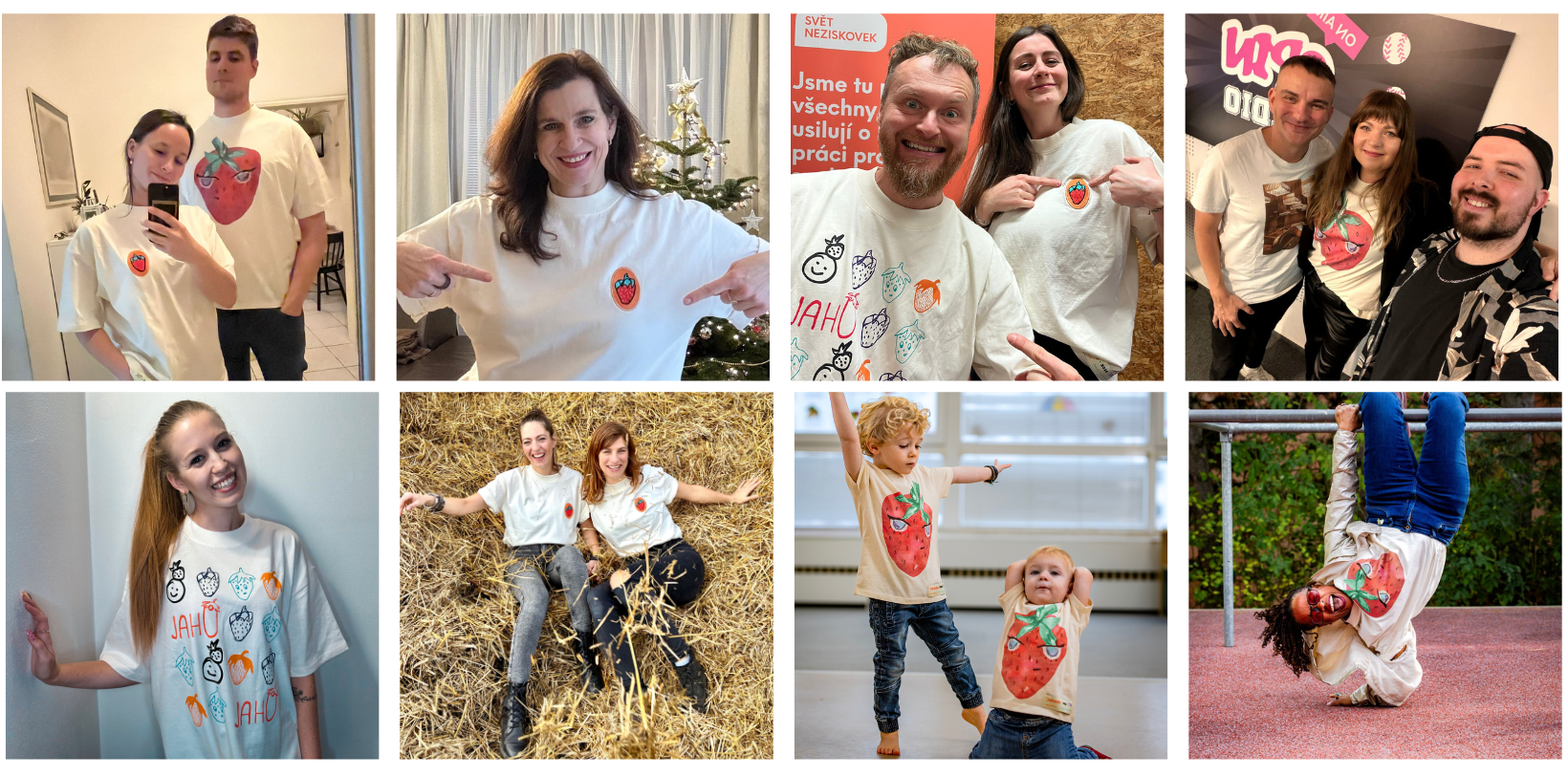 Chtěli bychom vám opravdu poděkovat. Tolik z vás si už pořídilo naše tričko – rodiče, děti, podporovatelé, hudebníci, kolegové… Vaše fotky a pozitivní zprávy nám dělají obrovskou radost. Ta je o to větší, že celý tenhle projekt je pro nás jedna velká premiéra. Moc si vážíme toho, že jste do toho s námi šli a pomáháte nám skrze šťavnatá trička posílat do světa vzkaz, že Jahoda není jen organizace, ale živá komunita lidí, které podpora dětí není lhostejná. Díky!