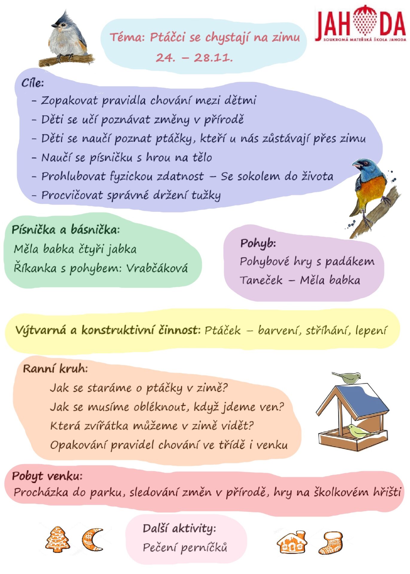 Po příchodu dítěte z jahodové školky uslyšíte na otázku “Co jste dělali dnes ve školce?” odpověď plnou nových zážitků a informací. Mezi pravidelné vzdělávací aktivity v jahodové školce patří: